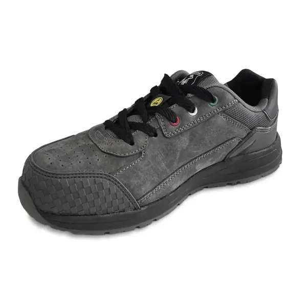 Moderner S3 Sicherheitsschuh mit Glasfaser-Zehenkappe, rutschfester EVA/Gummi-Sohle (SRC) und wasserabweisendem Obermaterial.