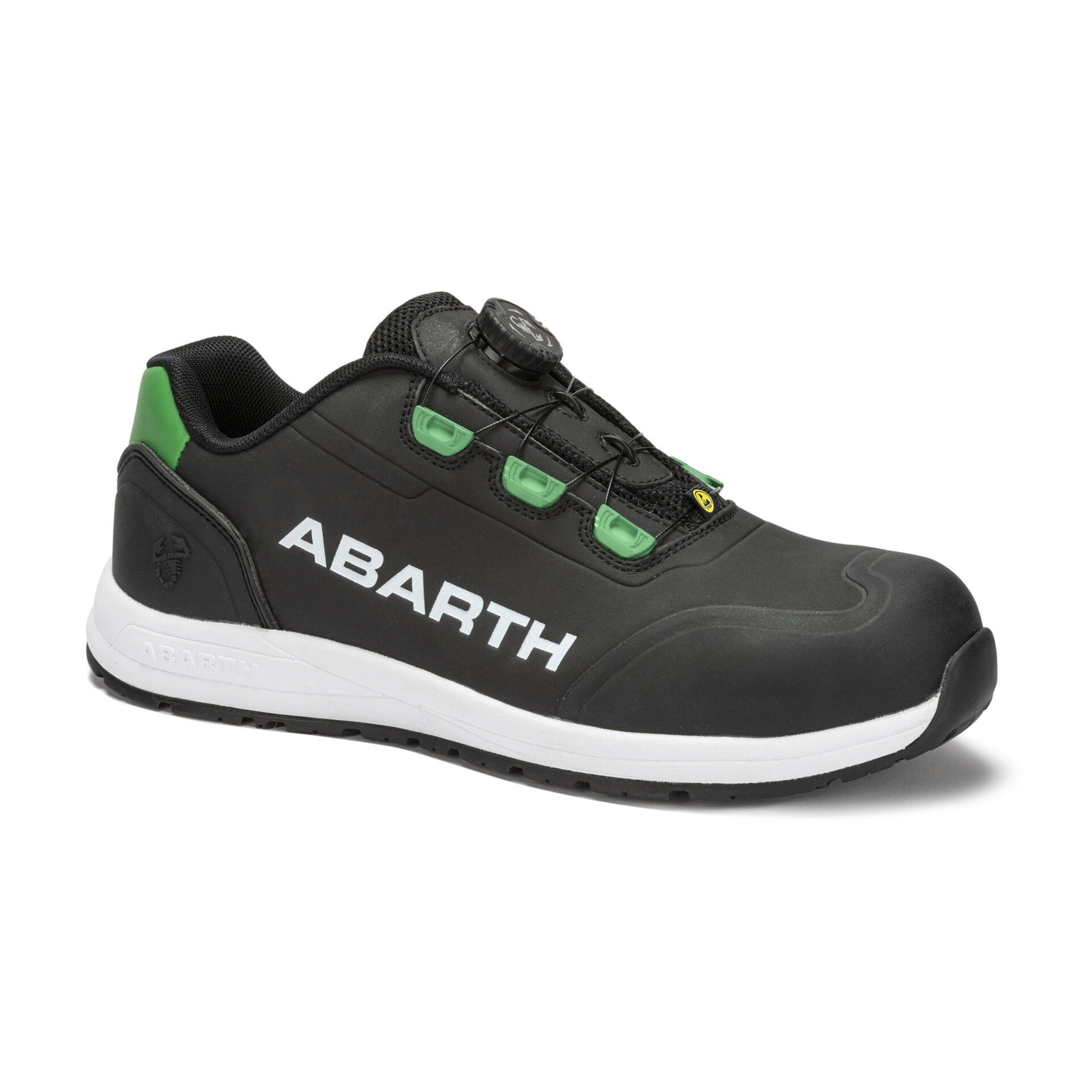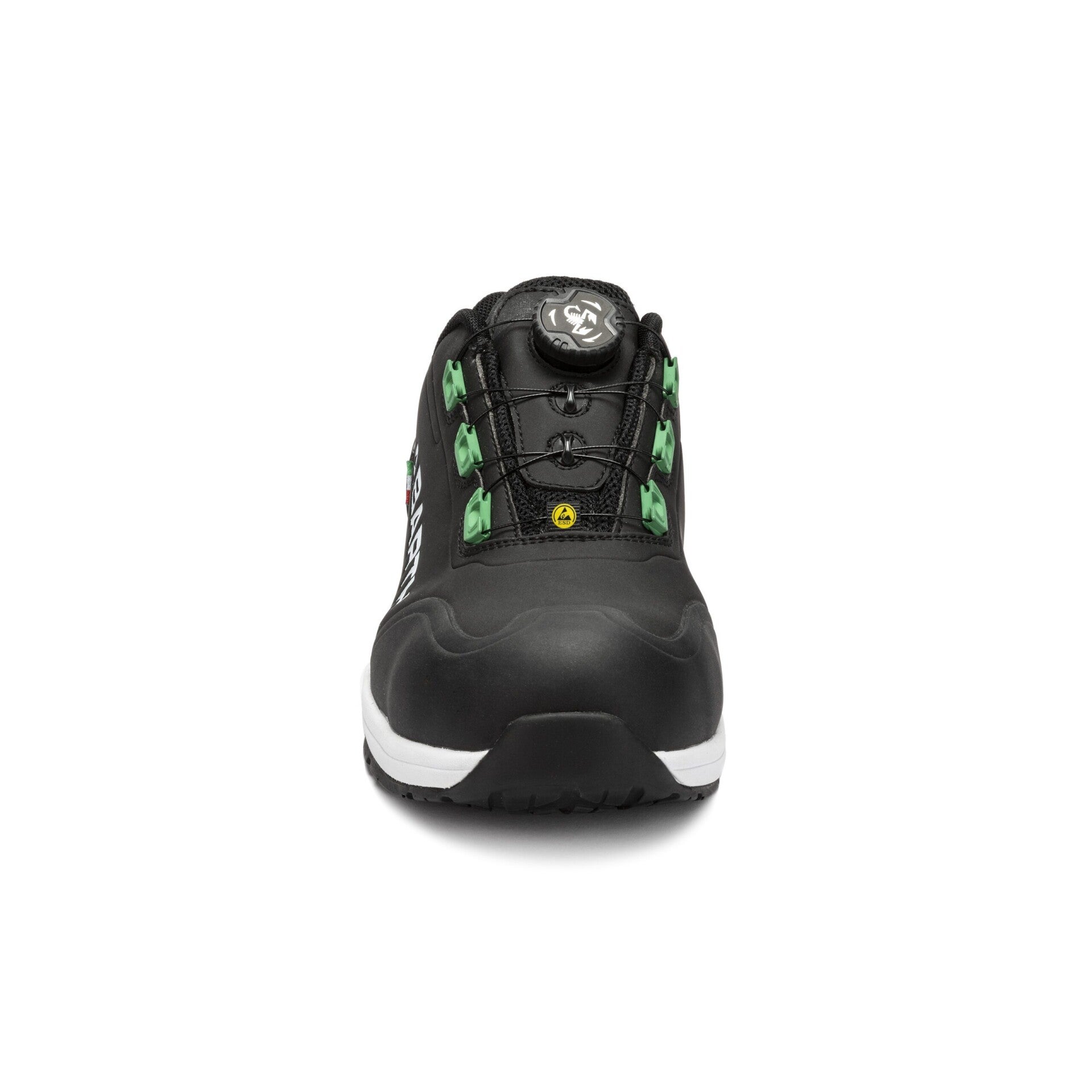 Sportlicher S3 Arbeitsschuh in tiefem Schwarz mit grünen Details. Öl- und hitzebeständige Sohle für zuverlässigen Halt in allen Arbeitsumgebungen.